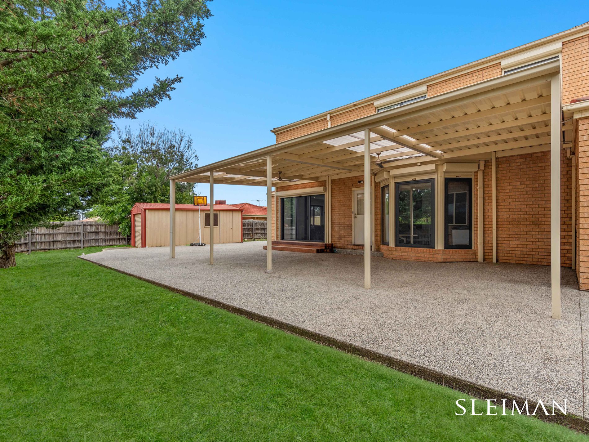 At the heart of the home, the statement kitchen is defined by expansive stone surfaces, waterfall island benching, full-height stone splashback, integrated cabinetry, matte black fixtures and premium appliances. Engineered timber flooring flows seamlessly throughout the living zones, while commercial-grade double-glazed aluminium windows provide superior thermal performance and acoustic insulation, a significant upgrade rarely seen in comparable homes. Step outdoors to a substantial alfresco area designed for large-scale entertaining, complemented by a side garden ideal for children and pets, plus a rear shed offering practical storage or workspace flexibility.